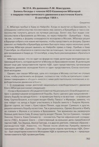 Из дневника Л.М. Максудова. Запись беседы с членом НСО Казимиром Мбагирой о лидерах повстанческого движения в восточном Конго. 8 сентября 1964 г. // РГАНИ. Ф. 5. Оп. 50. Д. 604. Л. 161-166. Подлинник. Машинопись. Подпись - автограф.