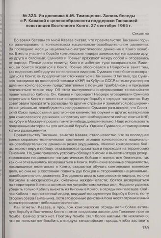 Из дневника А.М. Тимощенко. Запись беседы с Р. Кававой о целесообразности поддержки Танзанией повстанцев Восточного Конго. 27 сентября 1965 г. 10 ноября 1965 г. // РГАНИ. Ф. 5. Оп. 50. Д. 698. Л. 343-345. Подлинник. Машинопись. Подписи - автографы.