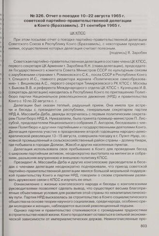 Отчет о поездке 10-22 августа 1965 г. советской партийно-правительственной делегации в Конго (Браззавиль). 21 сентября 1965 г. // РГАНИ. Ф. 5. Оп. 50. Д. 699. Л. 264-271. Подлинник. Машинопись. Подписи - автографы.