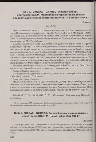 СКССАА - ЦК КПСС. Запись беседы с национальным секретарем ЮНИП М. Чона. 23 ноября 1964 г. // РГАНИ. Ф. 5. Оп. 50. Д. 642. Л. 232-234. Подлинник. Машинопись. Подпись - автограф.