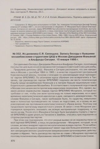 Из дневника С.Я. Синицына. Запись беседы с бывшими мозамбикскими студентами ЦКШ в Москве Джорджем Фаньяной и Альфредо Сигауке. 15 января 1966 г. // РГАНИ. Ф. 5. Оп. 50. Д. 767. Л. 48-50. Копия. Машинопись. Подпись заверителя - автограф.