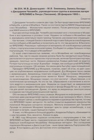 М.В. Домогацких - М.В. Зимянину. Запись беседы с Джорджем Чиламбе, руководителем группы в военном лагере ФРЕЛИМО в Линди (Танзания). 28 февраля 1966 г. // РГАНИ. Ф. 5. Оп. 50. Д. 767. Л. 92-94. Копия. Машинопись. Подпись заверителя - автограф.