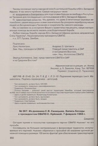 Главная Россия и Африка. 1961-начало 1970-х Из дневника С.Я. Синицына. Запись беседы с президентом СВАПО С. Нуй...