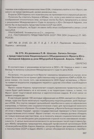Из дневника П.Ф. Шахова. Запись беседы с представителем Национального объединенного фронта Юго-Западной Африки д-ром Мбурумбой Кериной. Апрель 1966 г.