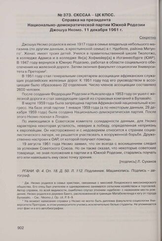 СКССАА - ЦК КПСС. Справка на президента Национально-демократической партии Южной Родезии Джошуа Нкомо. 11 декабря 1961 г. // РГАНИ. Ф. 4. Оп. 18. Д. 50. Л. 112. Подлинник. Машинопись. Подпись - автограф.