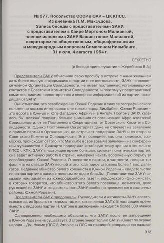 Посольство СССР в ОАР - ЦК КПСС. Из дневника Л.М. Максудова. Запись беседы с представителями ЗАНУ: с представителем в Каире Мортоном Малиангой, членом исполкома ЗАНУ Вашингтоном Малиангой, секретарем по общественным, общеафриканским и международным вопросам Симпсоном Ниамбинге. 31 июля, 4 августа 1964 г.