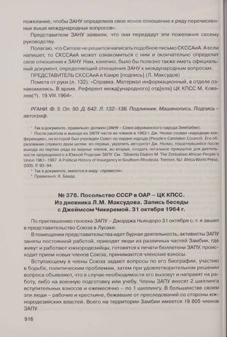 Посольство СССР в ОАР - ЦК КПСС. Из дневника Л.М. Максудова. Запись беседы с Джеймсом Чикеремой. 31 октября 1964 г. // РГАНИ. Ф. 5. Оп. 50. Д. 603. Л. 320-322. Подлинник. Машинопись. Подпись - автограф.