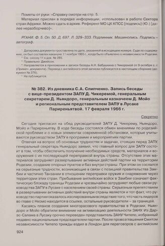 Из дневника С.А. Слипченко. Запись беседы с вице-президентом ЗАПУ Д. Чикеремой, генеральным секретарем Д. Ньяндоро, генеральным казначеем Д. Мойо и региональным представителем ЗАПУ в Лусаке Париреньятвой. 17 февраля 1966 г. // РГАНИ. Ф. 5. Оп. 50. Д. 766. Л. 320-322. Подлинник. Машинопись. Подпись - автограф.