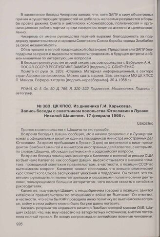 ЦК КПСС. Из дневника Г.И. Харьковца. Запись беседы с советником посольства Югославии в Лусаке Николой Шашичем. 17 февраля 1966 г. // РГАНИ. Ф. 5. Оп. 50. Д. 766. Л. 323-324. Подлинник. Машинопись. Подпись - автограф.
