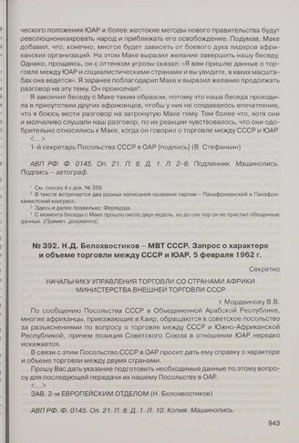 Н.Д. Белохвостиков - МВТ СССР. Запрос о характере и объеме торговли между СССР и ЮАР. 5 февраля 1962 г.