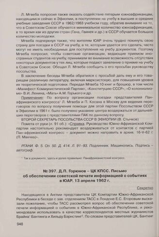 Д.П. Горюнов - ЦК КПСС. Письмо об обеспечении советской печати информацией о событиях в ЮАР. 13 апреля 1962 г.