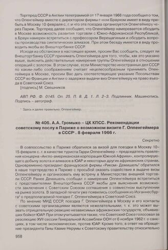 А.А. Громыко - ЦК КПСС. Рекомендации советскому послу в Париже о возможном визите Г. Оппенгеймера в СССР. 8 февраля 1966 г. // АВП РФ. Ф. 0145. Оп. 25. П. 8. Д. 1. Л. 4. Копия. Машинопись.