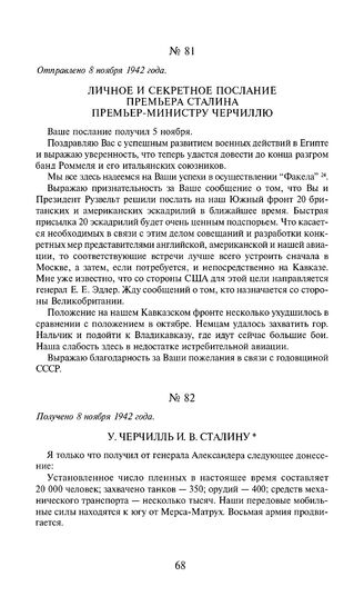 Личное и секретное послание премьера Сталина премьер-министру Черчиллю. Отправлено 8 ноября 1942 года