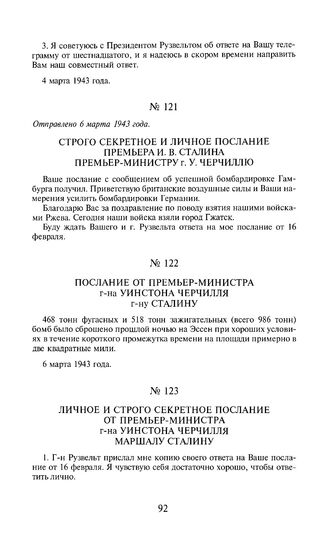 Строго секретное и личное послание премьера И.В. Сталина премьер-министру г. У. Черчиллю. Отправлено 6 марта 1943 года