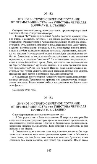 Личное и строго секретное послание от премьер-министра г-на Уинстона Черчилля маршалу И.В. Сталину. 5 сентября 1943 года [3]