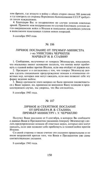 Личное послание от премьер-министра г-на Уинстона Черчилля маршалу И.В. Сталину. 8 сентября 1943 года
