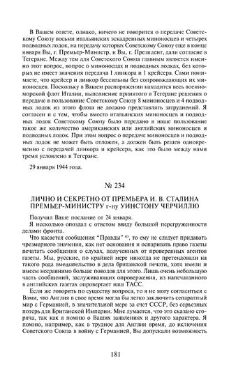 Лично и секретно от премьера И.В. Сталина премьер-министру г-ну Уинстону Черчиллю. 29 января 1944 года