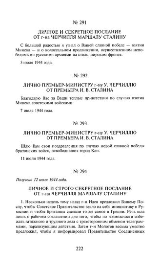 Личное и строго секретное послание от г-на Черчилля маршалу Сталину. Получено 12 июля 1944 года