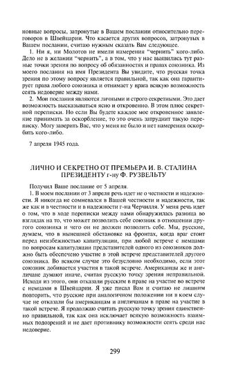 Приложение к посланию И.В. Сталина У. Черчиллю от 7 апреля 1945 года. Лично и секретно от премьера И.В. Сталина президенту г-ну Ф. Рузвельту. 7 апреля 1945 года [2]