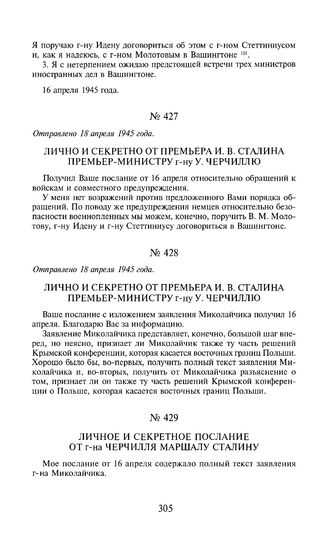 Лично и секретно от премьера И.В. Сталина премьер-министру г-ну У. Черчиллю. Отправлено 18 апреля 1945 года [2]
