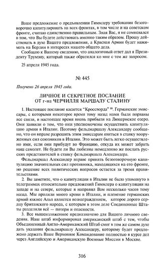 Личное и секретное послание от г-на Черчилля маршалу Сталину. Получено 26 апреля 1945 года