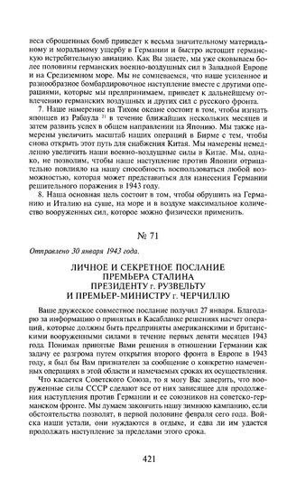 Личное и секретное послание премьера Сталина президенту г. Рузвельту и премьер-министру г. Черчиллю. Отправлено 30 января 1943 года