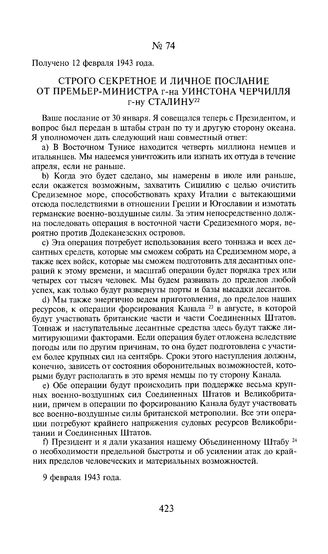 Строго секретное и личное послание от премьер-министра г-на Уинстона Черчилля г-ну Сталину. 9 февраля 1943 года. Получено 12 февраля 1943 года