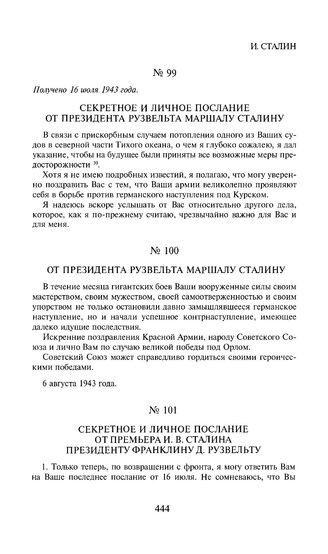 Секретное и личное послание от премьера И.В. Сталина президенту Франклину Д. Рузвельту. 8 августа 1943 года