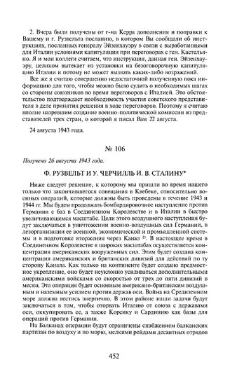 Главная Переписка И. Сталина с У. Черчиллем, К. Эттли, Ф. Рузвельтом и Г. Т... Ф. Рузвельт и У. Черчилль И.В. Сталину. Получено 26 августа 1943 года