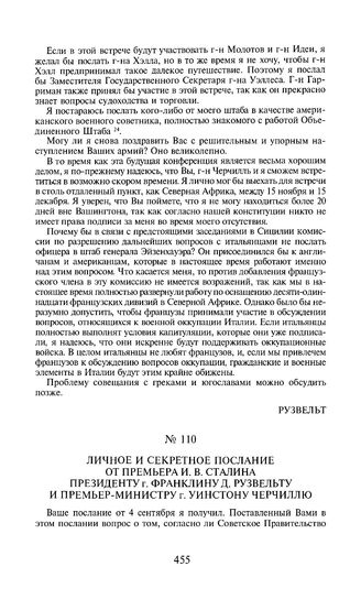 Личное и секретное послание от премьера И.В. Сталина президенту г. Франклину Д. Рузвельту и премьер-министру г. Уинстону Черчиллю. 7 сентября 1943 года