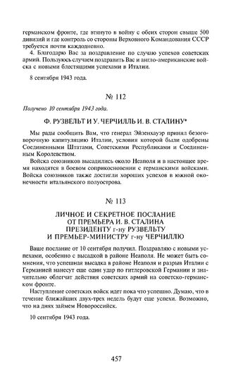 Личное и секретное послание от премьера И.В. Сталина президенту г-ну Рузвельту и премьер-министру г-ну Черчиллю. 10 сентября 1943 года.
