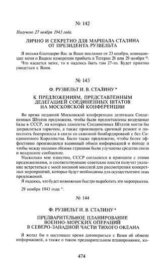 Ф. Рузвельт И.В. Сталину. Предварительное планирование военно-морских операций в северо-западной части Тихого океана. 29 ноября 1943 года