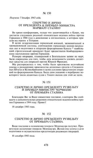 Секретно и лично президенту Рузвельту и премьер- министру Черчиллю от премьера Сталина. 10 декабря 1943 года
