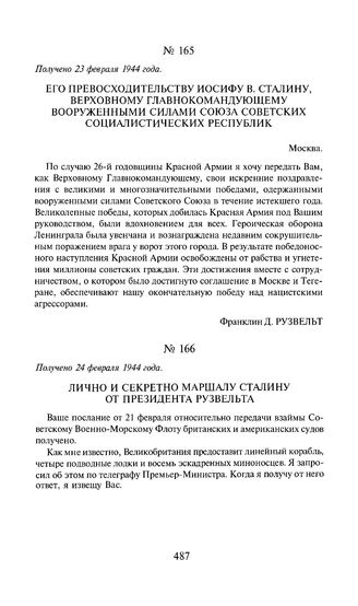 Лично и секретно маршалу Сталина от президента Рузвельта. Получено 24 февраля 1944 года