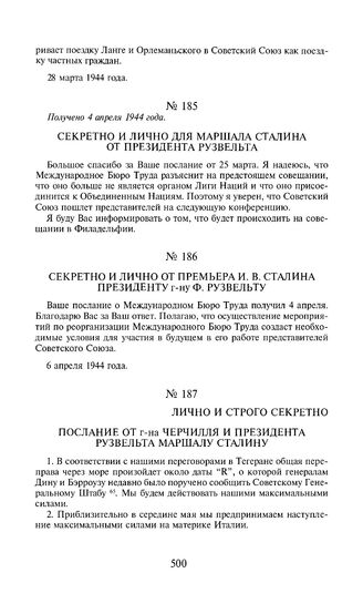 Секретно и лично для маршала Сталина от президента Рузвельта. Получено 4 апреля 1944 года