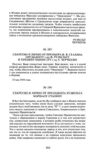 Секретно и лично от премьера И.В. Сталина президенту г-ну Ф. Рузвельту и премьер-министру г-ну У. Черчиллю. 15 мая 1944 года