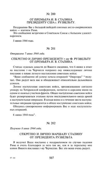 От премьера И.В. Сталина президенту США г. Рузвельту. 5 июня 1944 года
