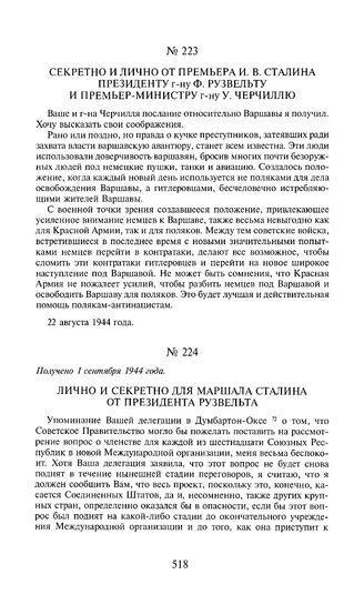 Секретно и лично от премьера И.В. Сталина президенту г-ну Ф. Рузвельту и премьер-министру г-ну У. Черчиллю. 22 августа 1944 года
