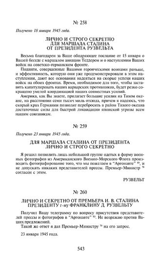 Лично и строго секретно для маршала Сталина от президента Рузвельта. Получено 18 января 1945 года