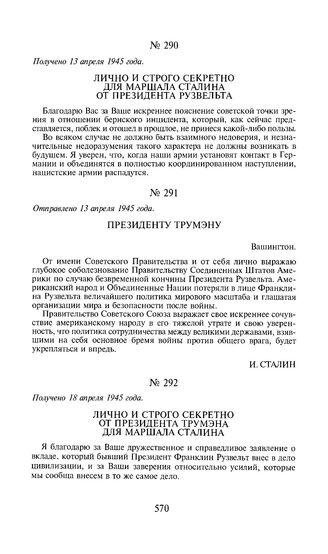 Лично и строго секретно для маршала Сталина от президента Рузвельта. Получено 13 апреля 1945 года