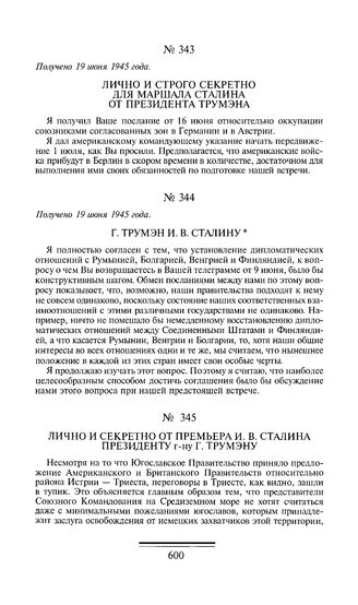 Лично и секретно от премьера И.В. Сталина президенту г-ну Г. Трумэну. 21 июня 1945 года