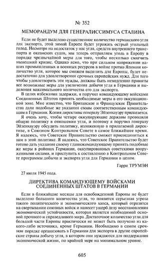 Приложение к меморандуму для генералиссимуса Сталина от 27 июля 1945 года. Директива командующему войсками Соединенных Штатов в Германии.