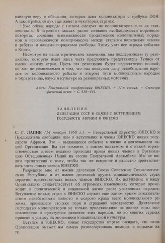 11-я сессия Генеральной конференции ЮНЕСКО, 1960 год. Заявления делегации СССР в связи с вступлением государств Африки в ЮНЕСКО // Акты Генеральной конференции ЮНЕСКО, - 11-я сессия. - Стенографический отчет. - С. 52,100-101.