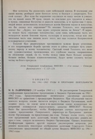 11-я сессия Генеральной конференции ЮНЕСКО, 1960 год. О бюджете на 1961-1962 годы и программе деятельности // Акты Генеральной конференции ЮНЕСКО. - 11-я сессия. - Стенографический отчет. - С. 142-143.
