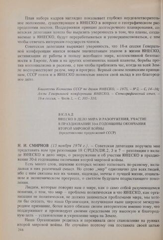 18-я сессия Генеральной конференции ЮНЕСКО, 1974 год. Вклад ЮНЕСКО в дело мира и разоружения, участие в праздновании 30-й годовщины окончания второй мировой войны (представление предложений СССР) // Акты Генеральной конференции ЮНЕСКО. - 18-я сессия. - Стенографический отчет. - Часть 2. - С. 120-123.