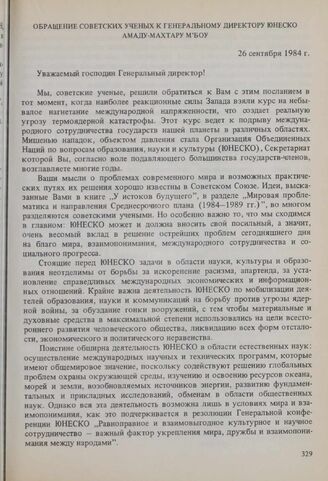 Обращение советских ученых к Генеральному директору ЮНЕСКО А.-М. М’Боу и его ответ в связи с обращением ученых. 26 сентября 1984 г.