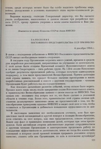 О советских предложениях к проекту Программы на 1986-1987 годы. Заявление Постоянного представительства СССР при ЮНЕСКО 6 декабря 1984 г.
