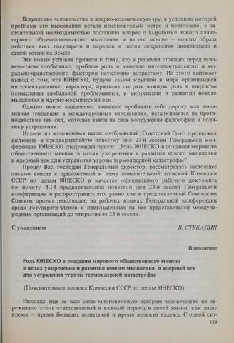 О советских предложениях к проекту Программы на 1986-1987 годы. Письмо Генеральному директору ЮНЕСКО, 6 сентября 1985 г. Роль ЮНЕСКО в создании мирового общественного мнения в целях укоренения и развития нового мышления в ядерный век для устранения угрозы термоядерной катастрофы. Пояснительная записка Комиссии СССР по делам ЮНЕСКО. (Приложение к письму от 6 сентября 1985 г.)