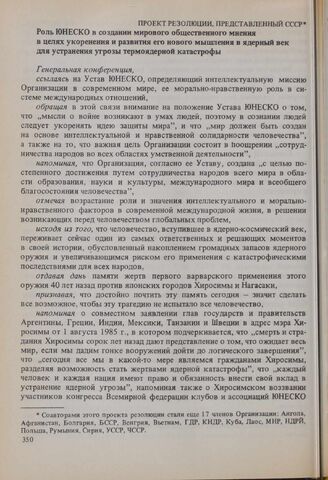 О советских предложениях к проекту Программы на 1986-1987 годы. Роль ЮНЕСКО в создании мирового общественного мнения в целях укоренения и развития нового мышления в ядерный век для устранения угрозы термоядерной катастрофы. Проект резолюции, представленный СССР к 23-й сессии Генеральной конференции // Бюллетень Комиссии СССР по делам ЮНЕСКО. - 1986. - № 1-2. - С. 60-75; Док. 23/95 от 14 декабря 1985 г.; 23 C/PLEN/DR.4 от 12 октября 1985 г.