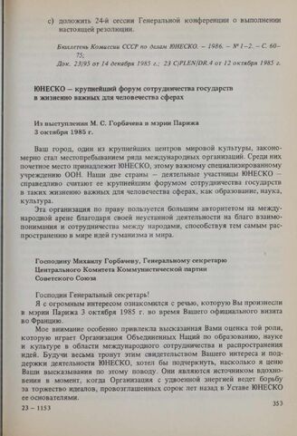 О советских предложениях к проекту Программы на 1986-1987 годы. ЮНЕСКО - крупнейший форум сотрудничества государств в жизненно важных для человечества сферах. Из выступления М.С. Горбачева в мэрии Парижа 3 октября 1985 г. и письмо Генерального директора ЮНЕСКО